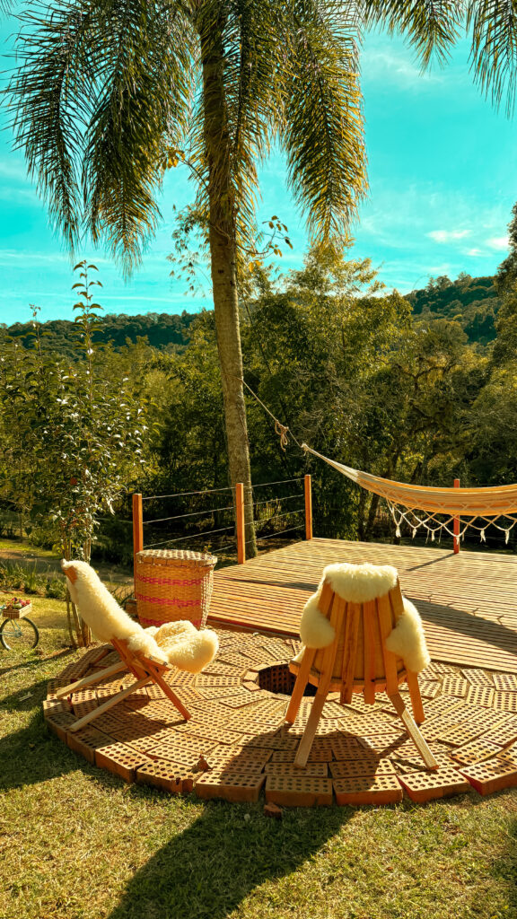 Área externa com deck para contemplação, rede de balanço e fogueira privativa para luau, com lenha fornecida para momentos inesquecíveis.